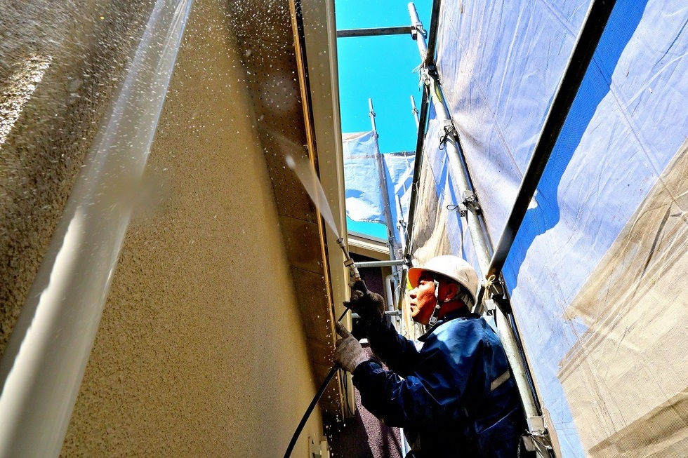 1階廻りが特にコケが酷く、凹部に埃なども入り込んでいるので、時間をかけて丁寧に洗い流しています。