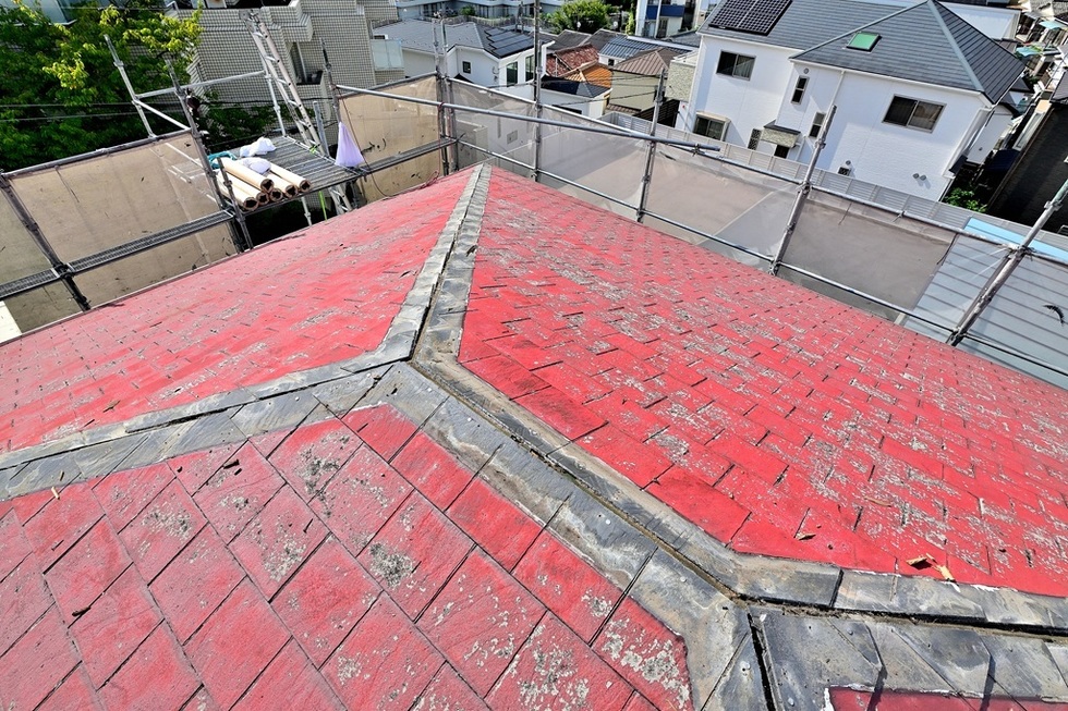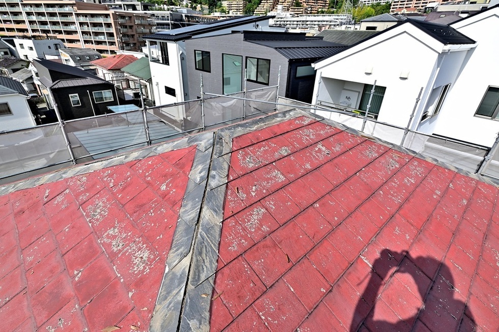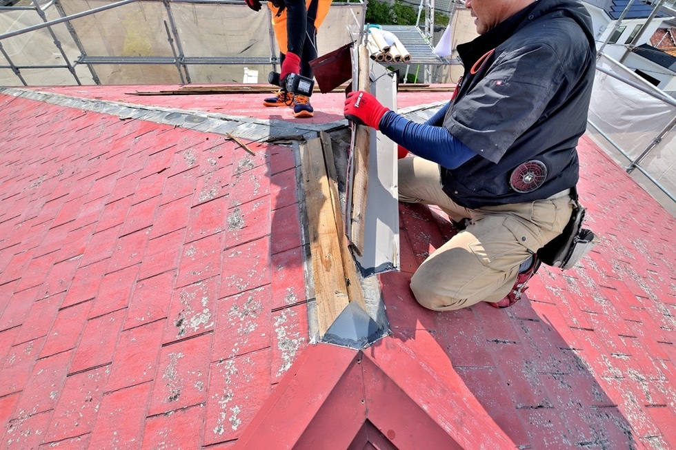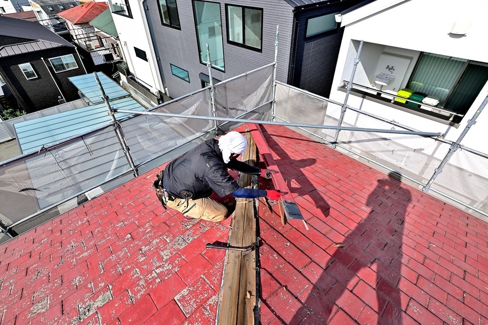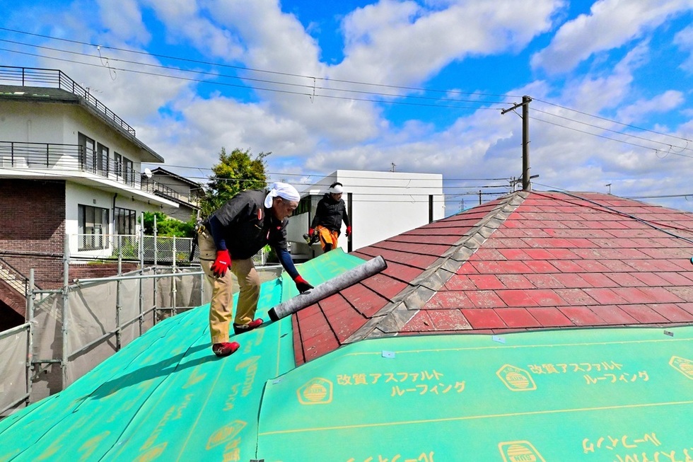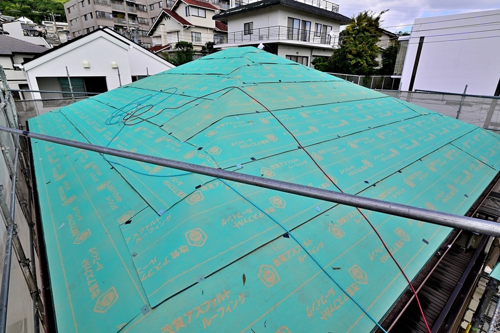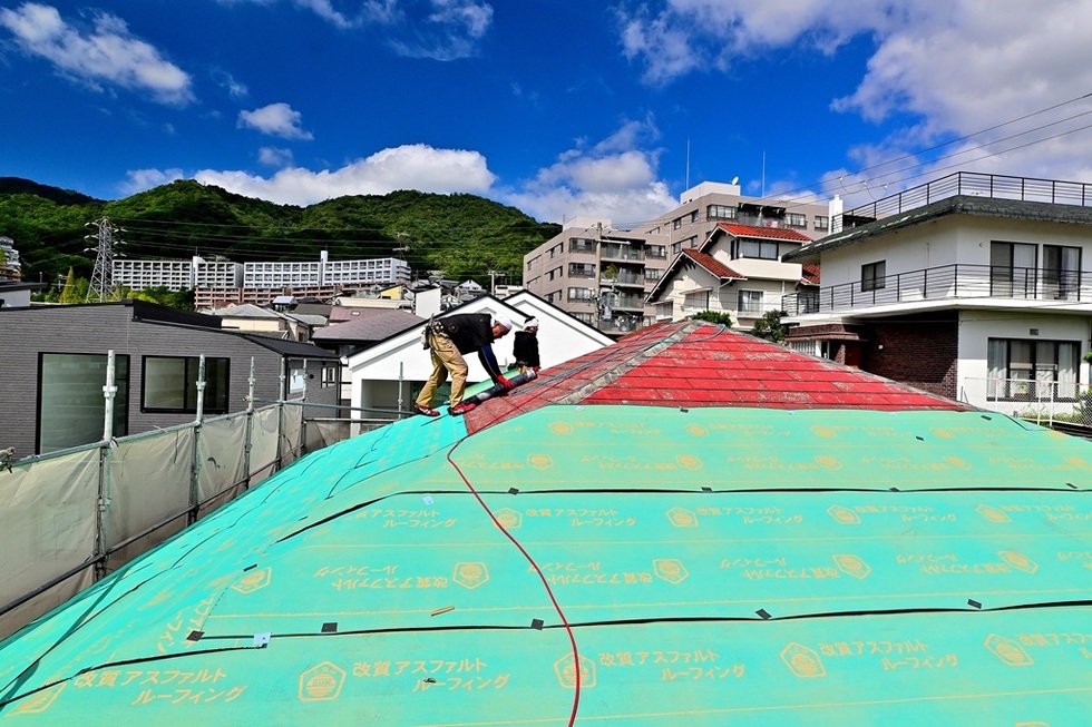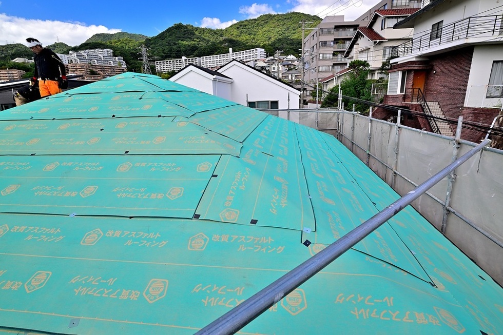 本日の作業内容は、芦屋市で屋根のカバー工法工事の施工工程内の棟板金と貫板解体と、2次防水の改質アスファルトルーフィング(ゴムアスルーフィング)の施工です。