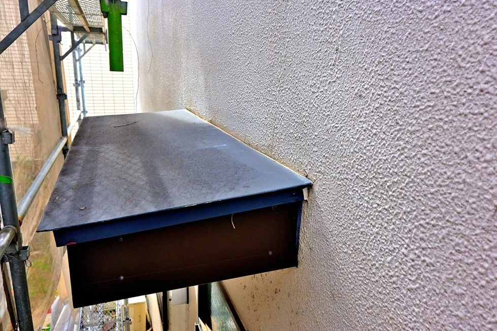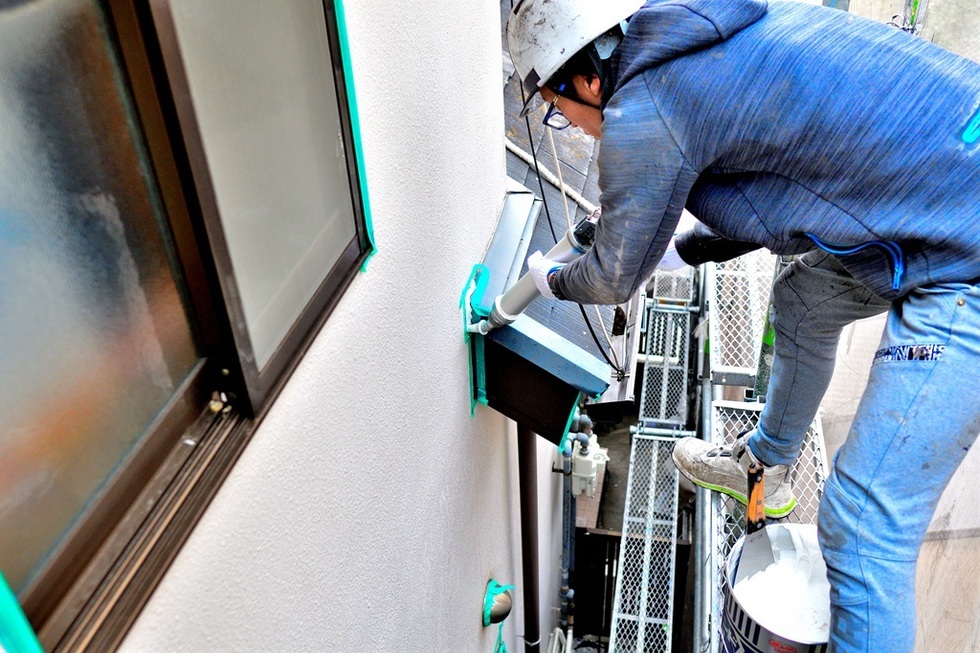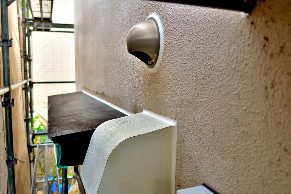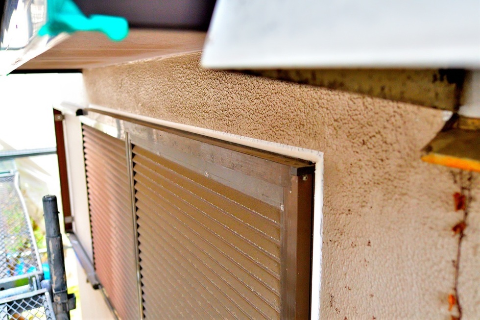 芦屋市でモルタル外壁の開口部の窓周りやパイプ類、換気口の貫通部や庇の取り合いなどのシーリング工事です。